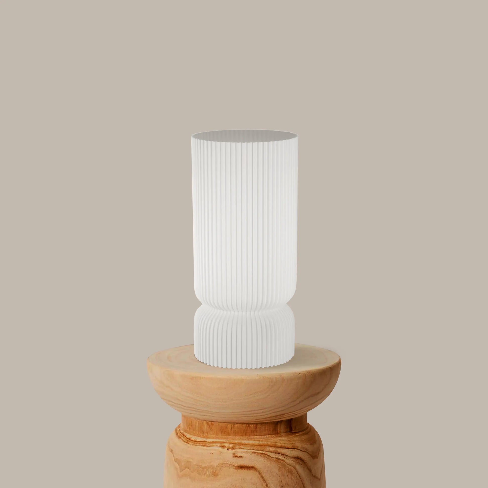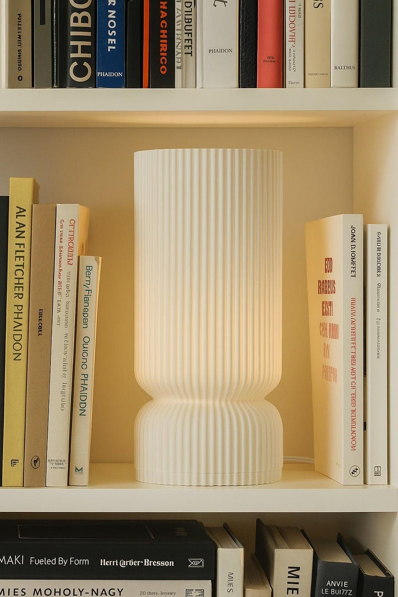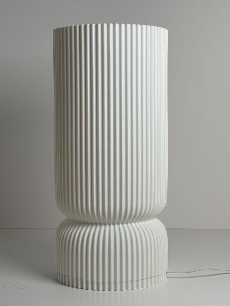Handcrafted in Los Angeles, each lamp is 3D-printed using sustainable materials, offering a refined balance between modern design and eco-conscious craftsmanship. Whether lit or unlit, its minimalist ribbed form stands as a stunning decorative statement piece.
